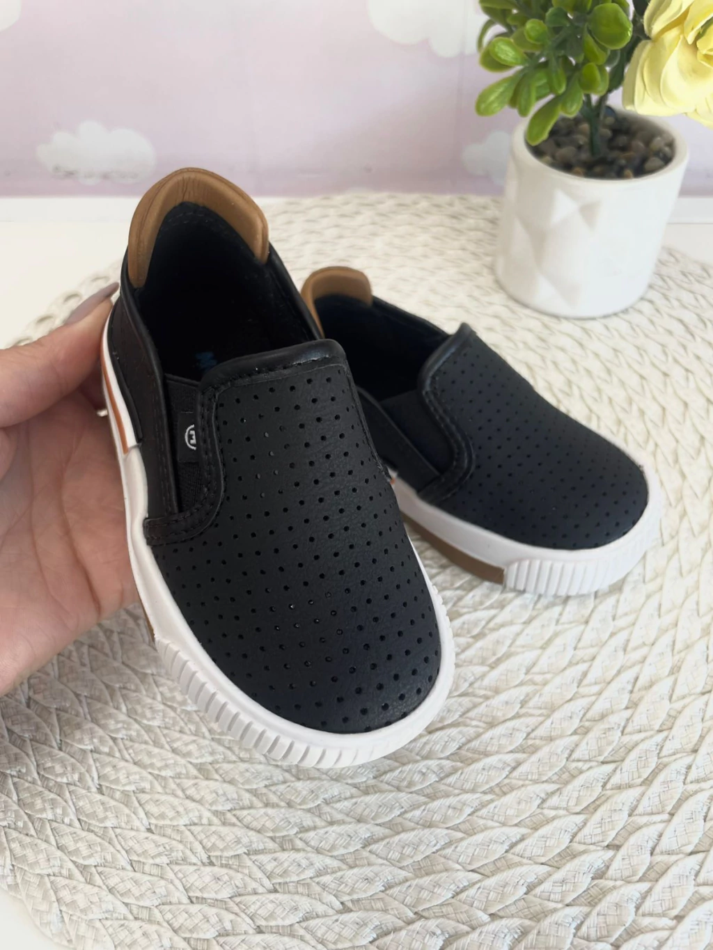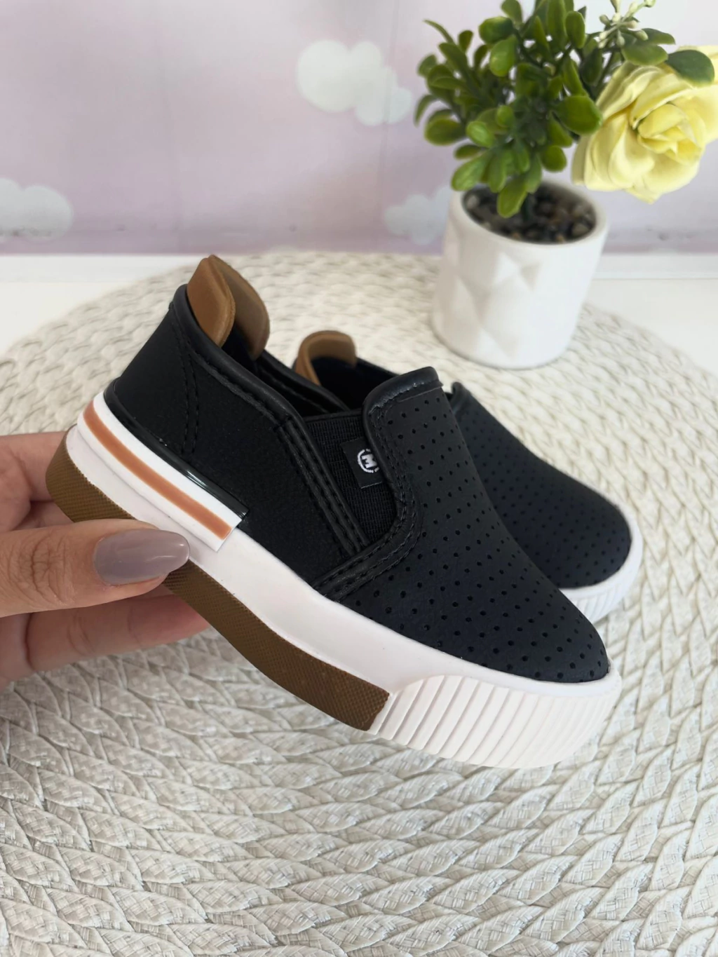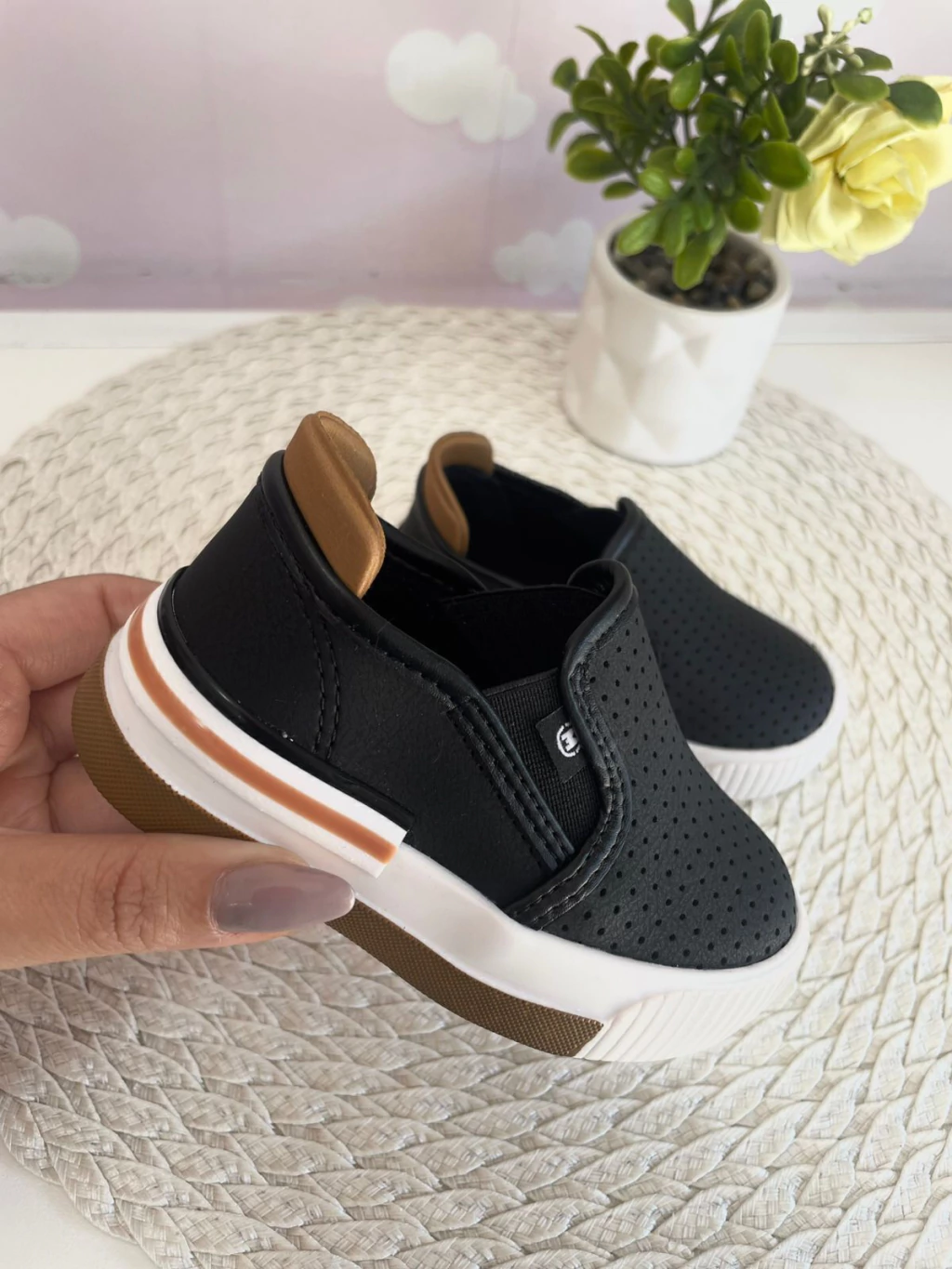 Modelo casual em napa na cor preto com detalhes em marrom e preto