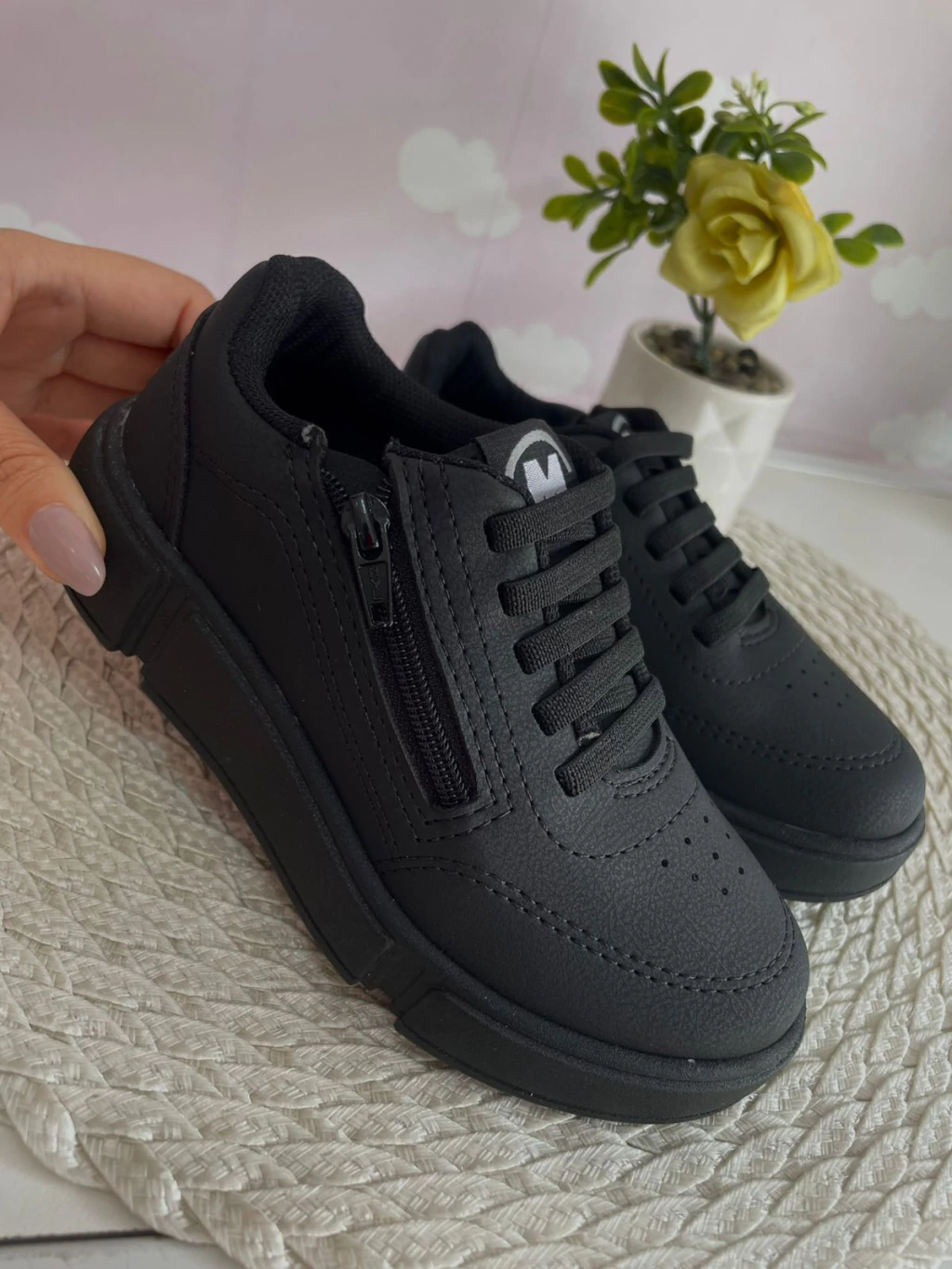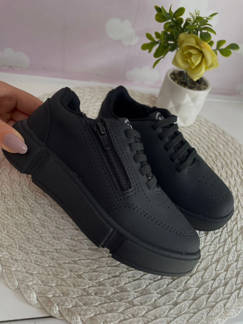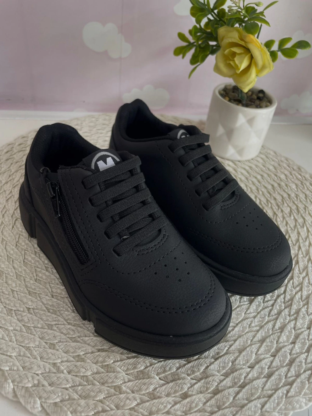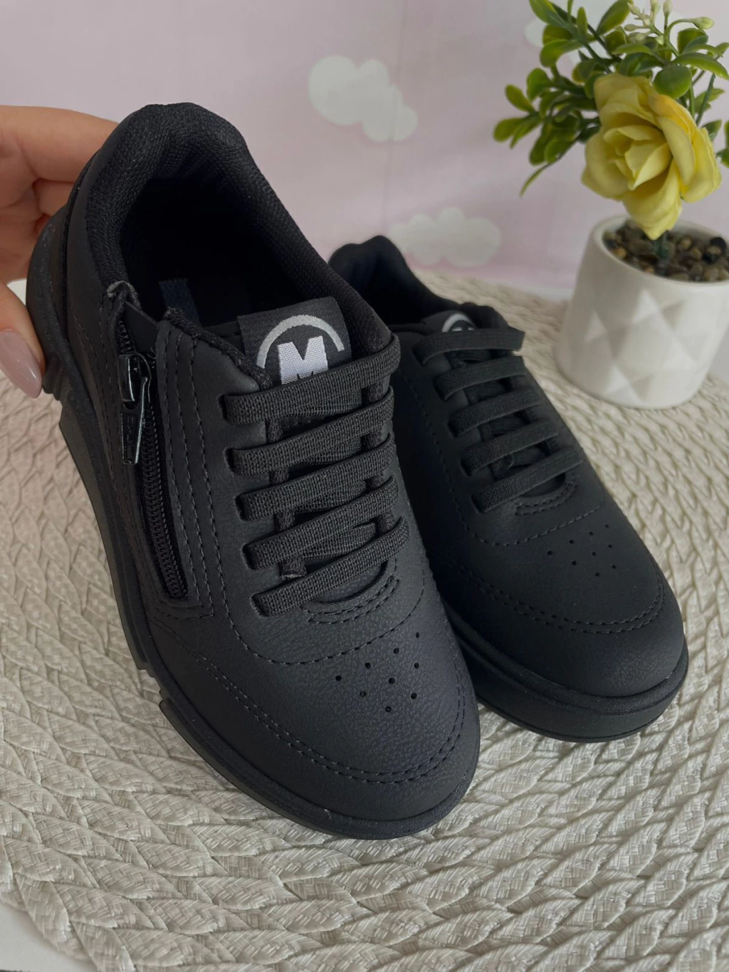 Tênis com elástico facilitando ao calçar.
